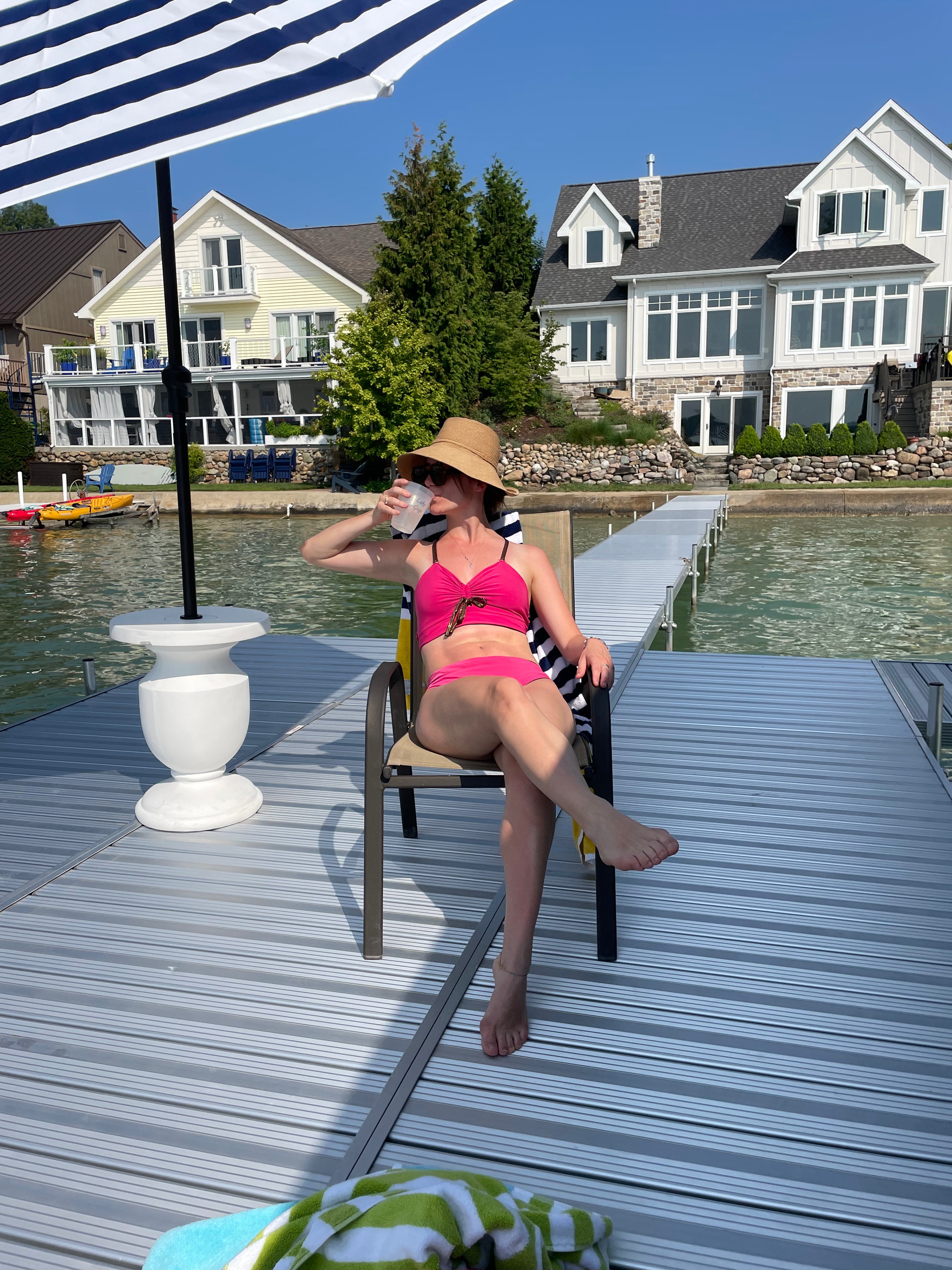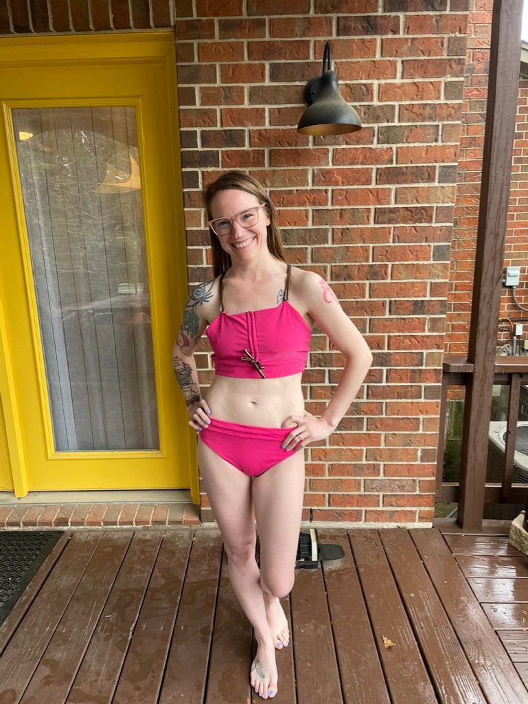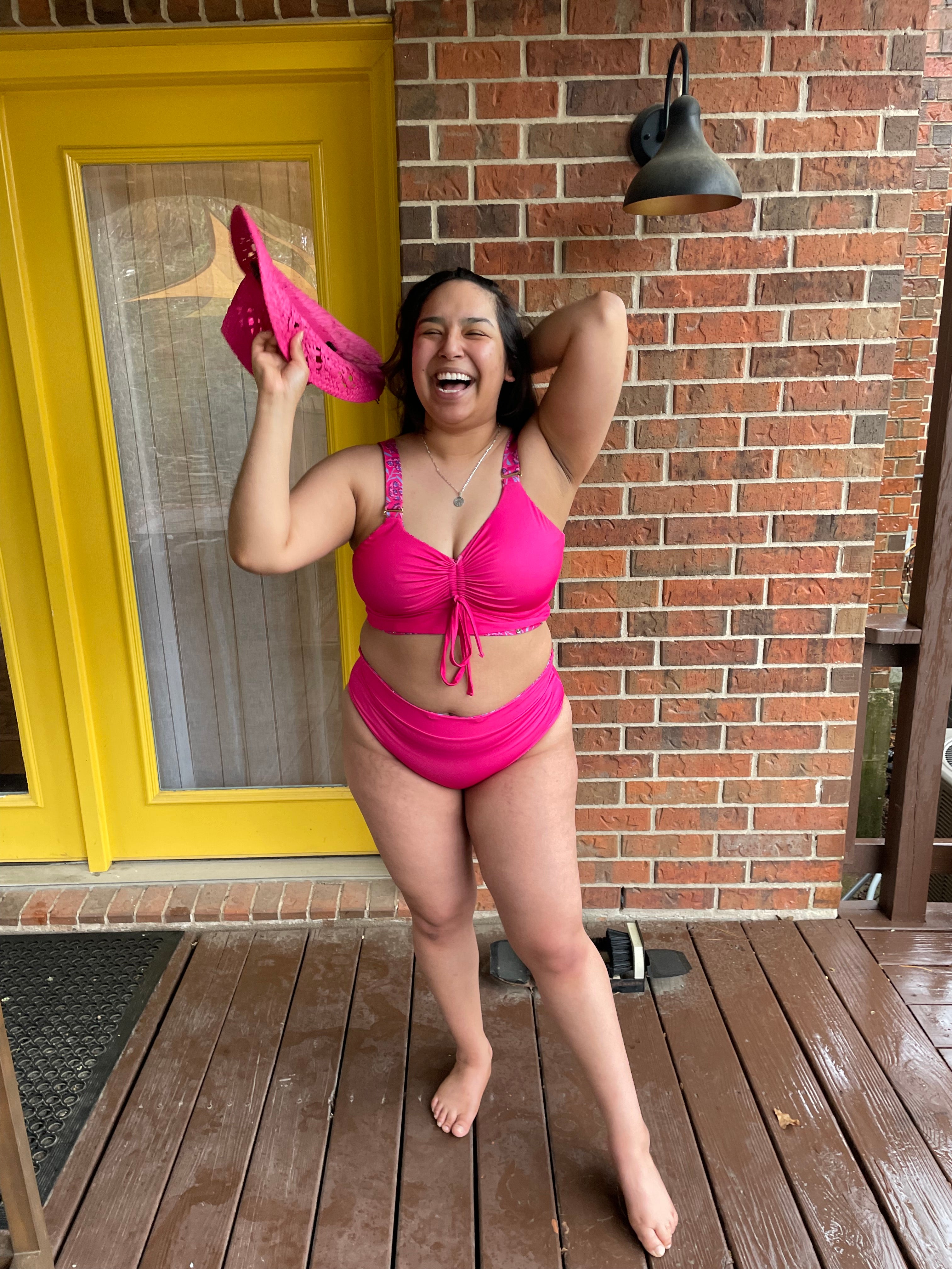 She's wearing our Anne Bikini in Pink. Size XL top and bottoms.
