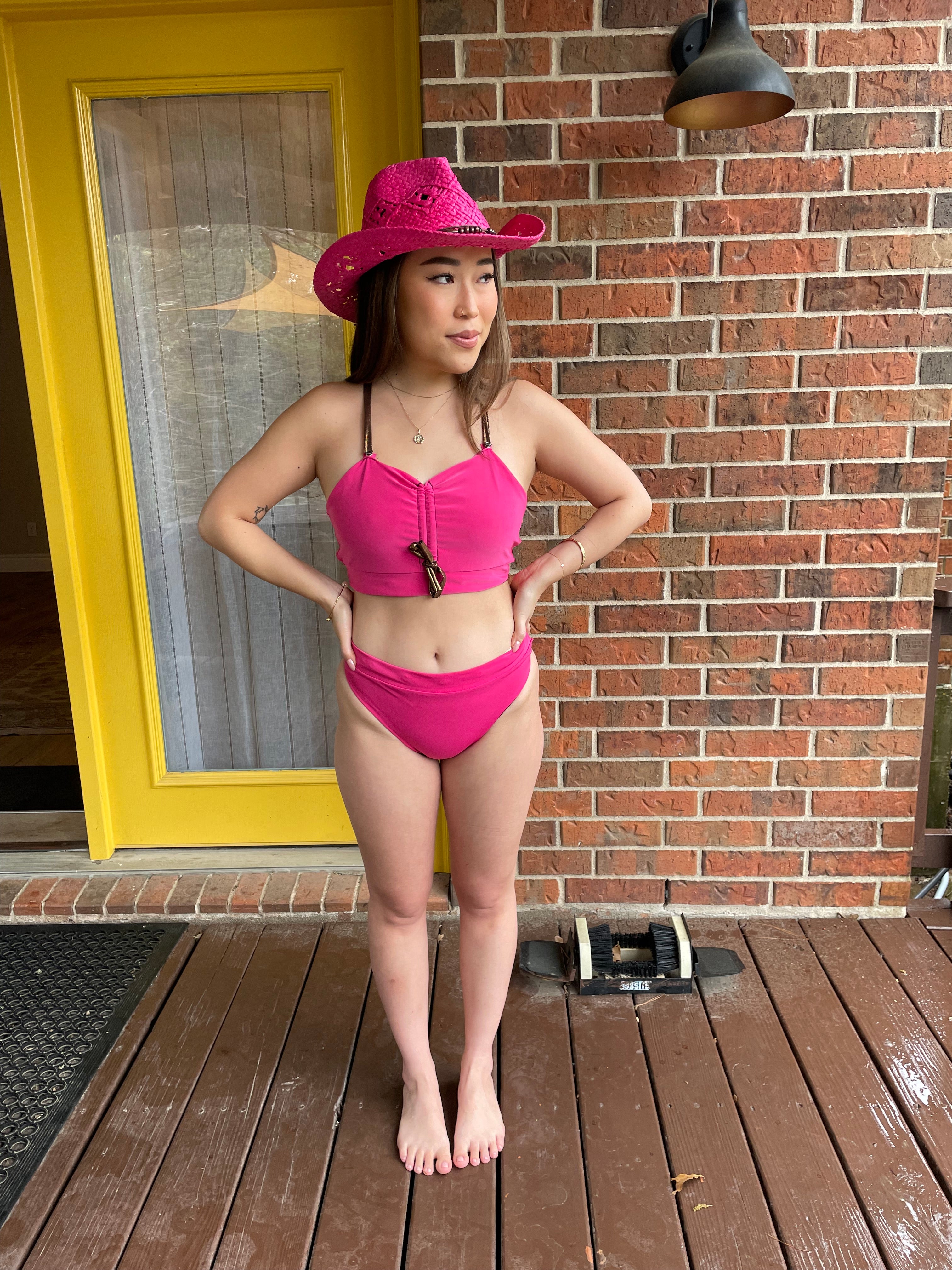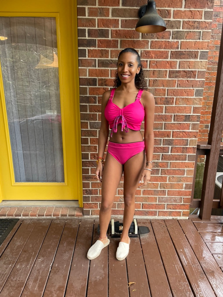 She's wearing our Anne Bikini in Pink. Size S top and size XS bottoms.