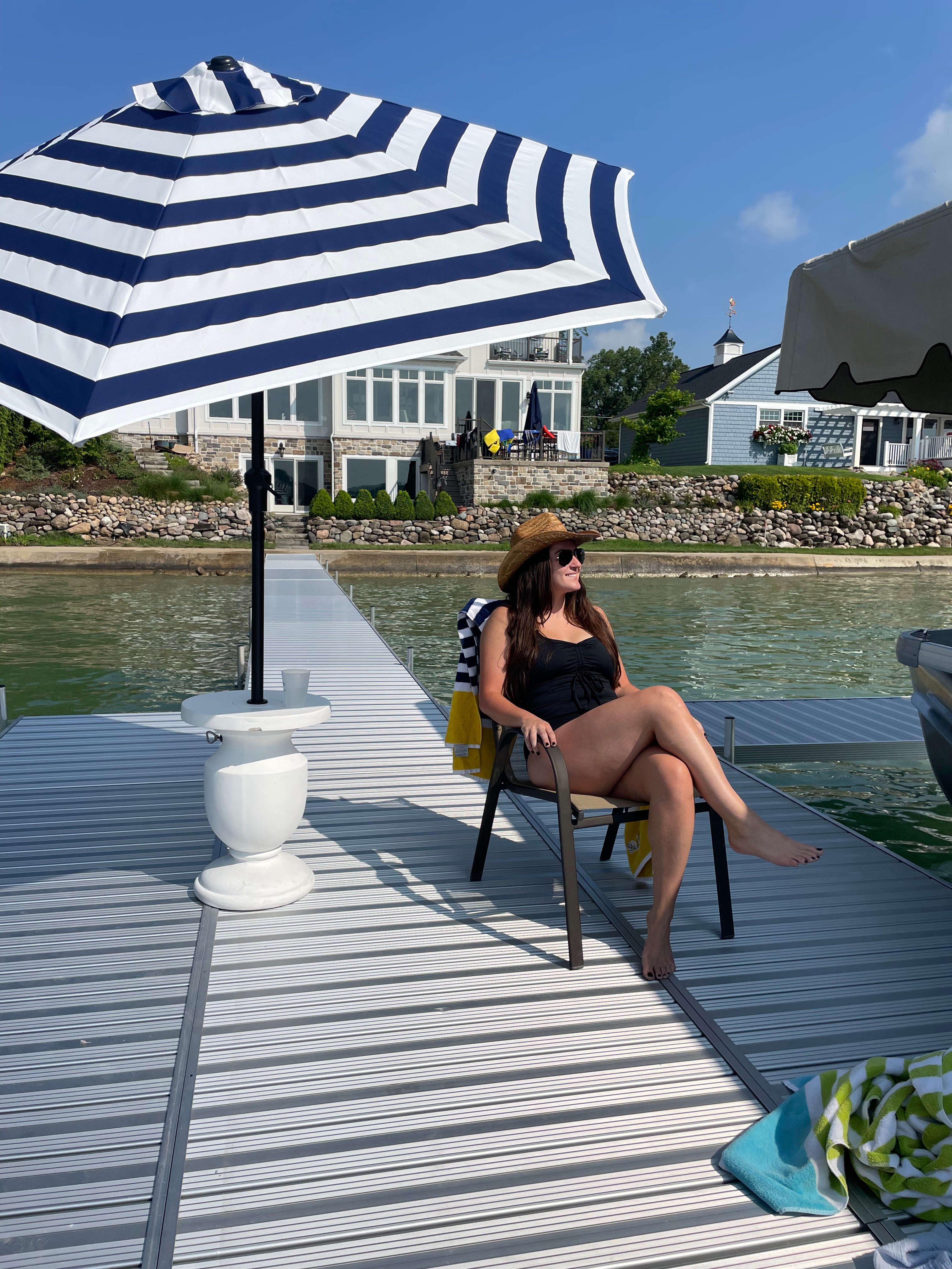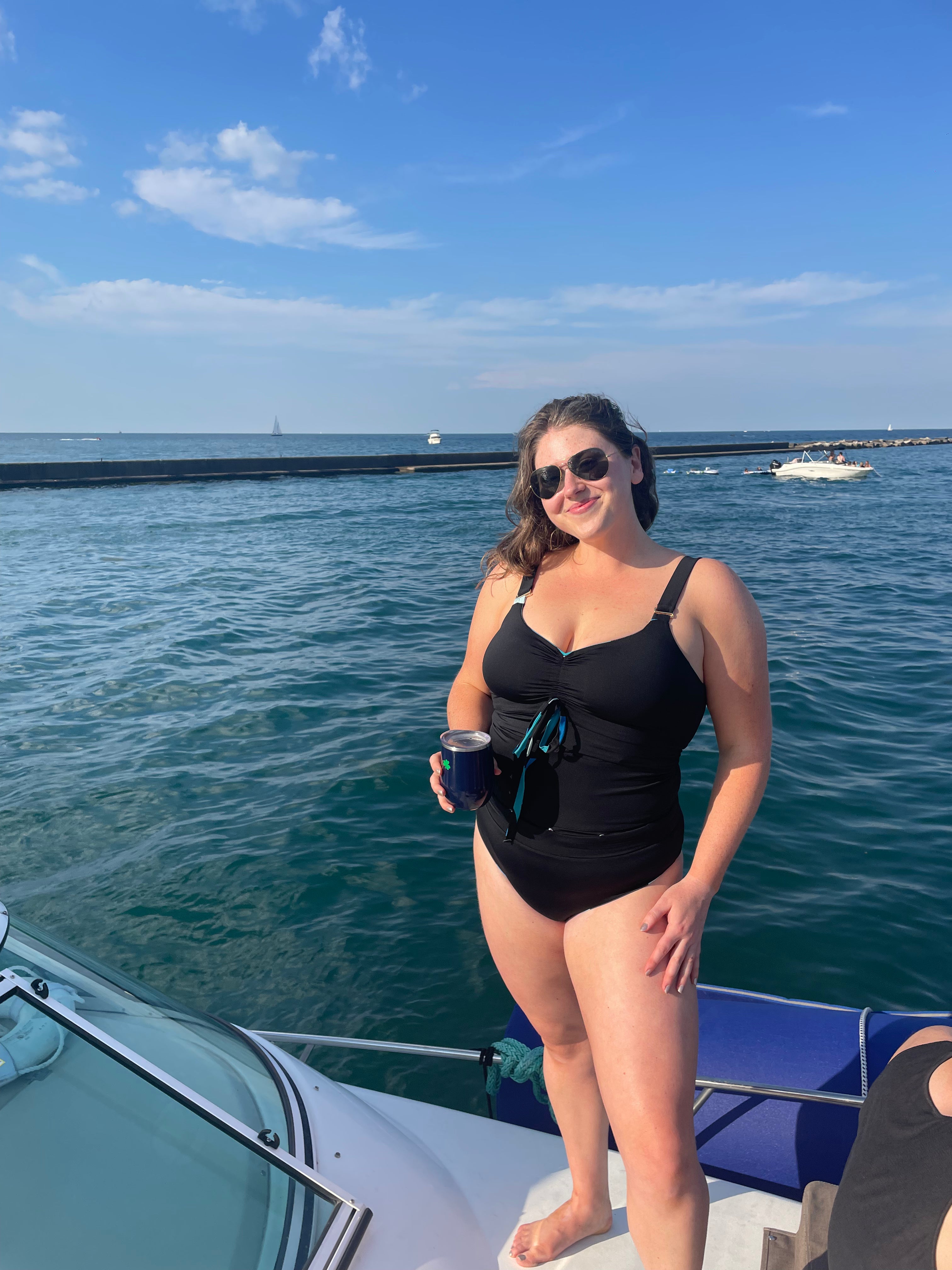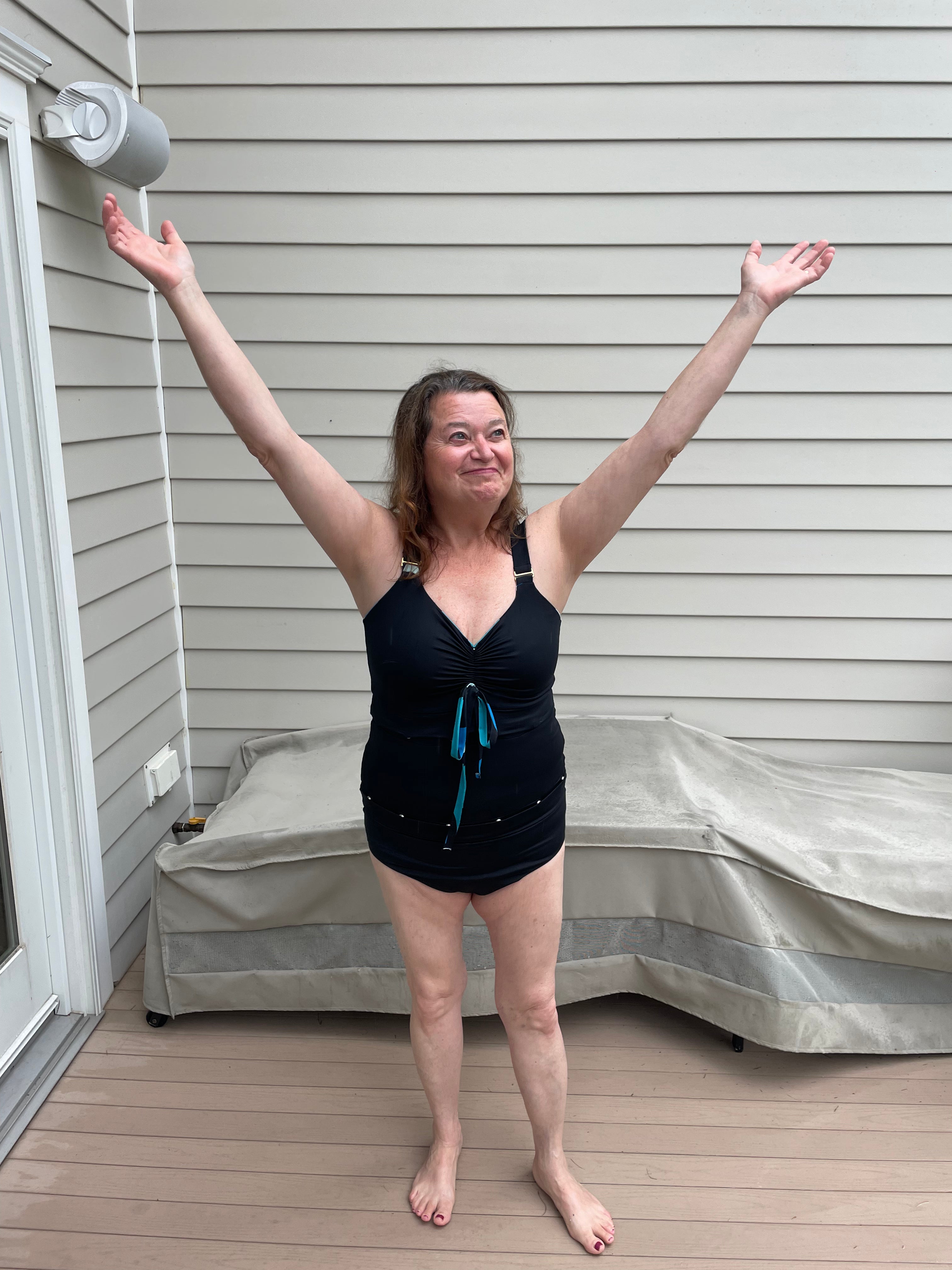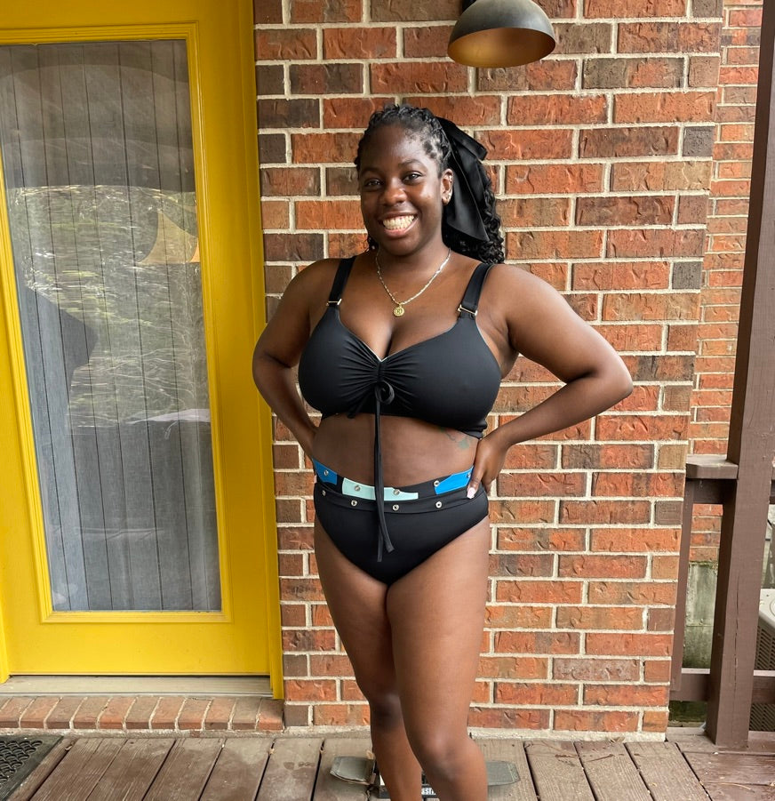 She's wearing our Novanista All-In-One bathing suit in black. Size L top, middle, and bottom.