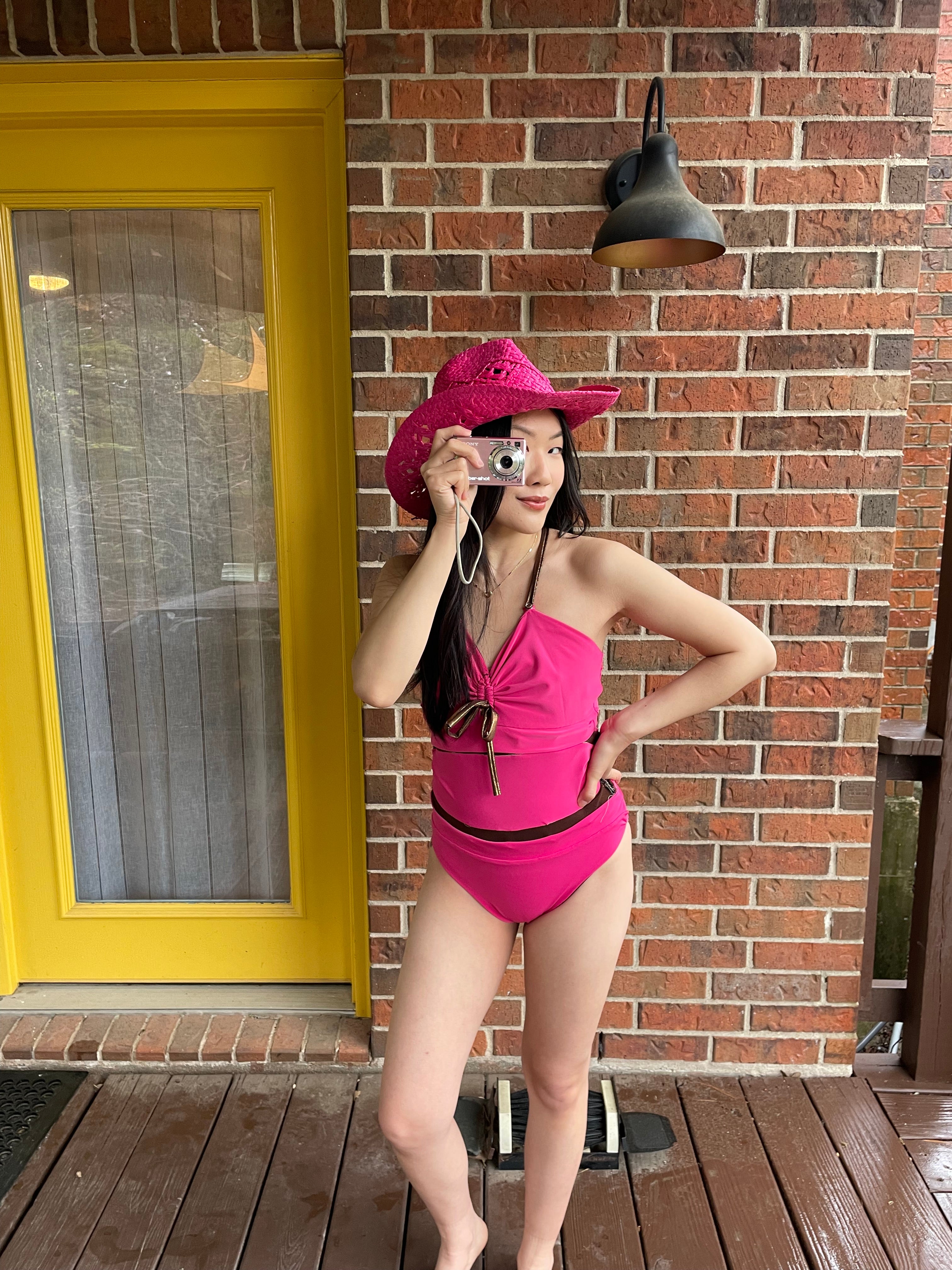 She's wearing our Anne Bikini in Pink. Size S top and bottom.